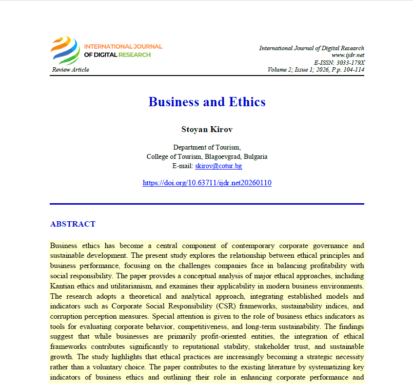 The article titled “Business and Ethics” by Stoyan Kirov explores the evolving role of ethical principles in modern business environments. The study examines key concepts such as corporate social responsibility (CSR), environmental, social, and governance (ESG) criteria, and ethical decision-making in corporate management.